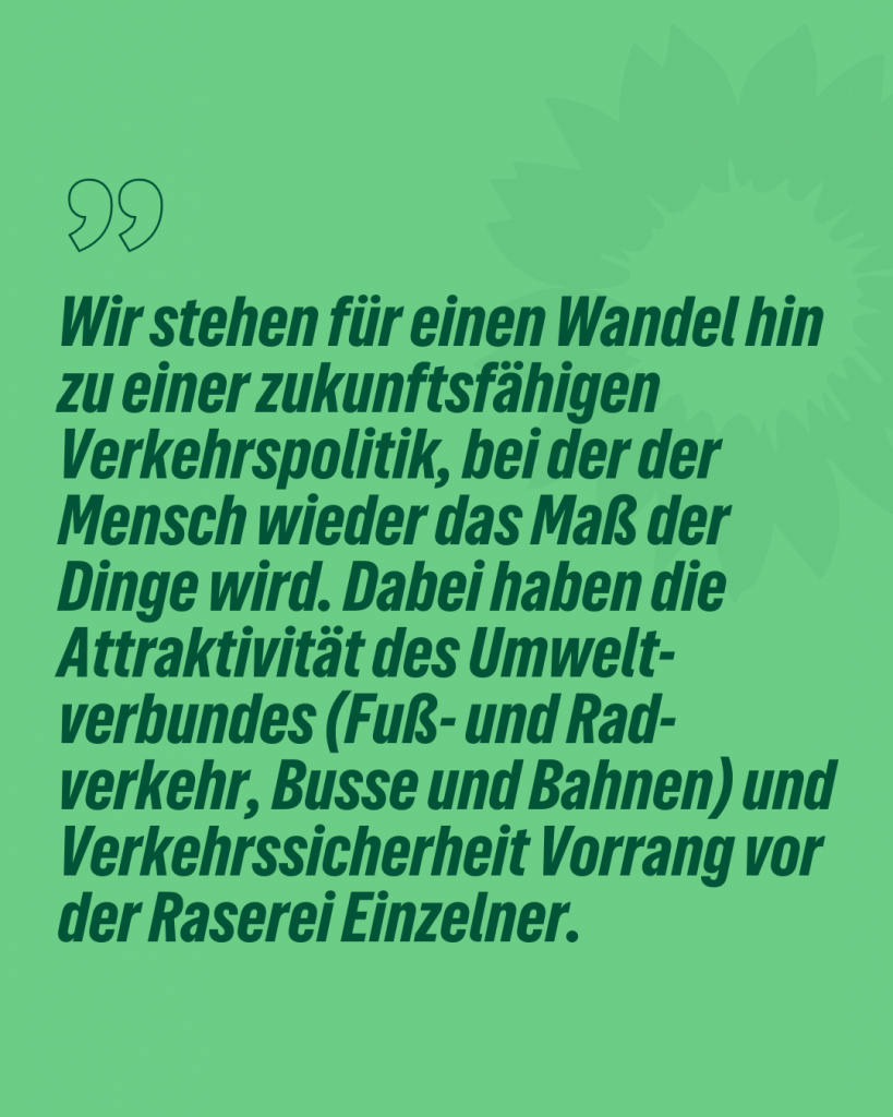 Wir wollen die Stadt zu einer radlfreundlichen Stadt umgestalten. Dazu gehören Radfahrstreifen, Tempobeschränkungen, Wegweiser und sichere Abstellanlagen (z.B. Radstationen an den Bahnhöfen zum überdachten und diebstahlsicheren Abstellen, mit Radservice und Radverleih). Im „Aktionsplan für nachhaltige Energie“ hat sich der Stadtrat zur 15%igen Reduzierung des motorisierten Verkehrs bis 2020 verpflichtet. Der Runde Tisch Radverkehr muss deshalb endlich zur Chefsache werden, damit sich MitbürgerInnen und Vereine beteiligen.